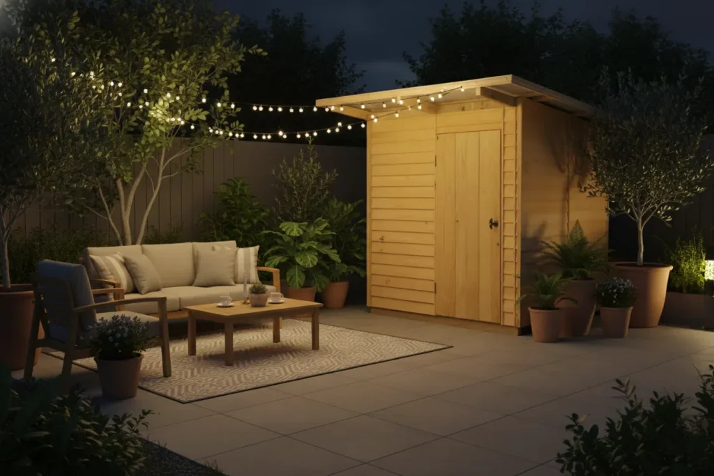 - Fit timber shelving sets to create organised storage zones for tools, paints, and smaller items.