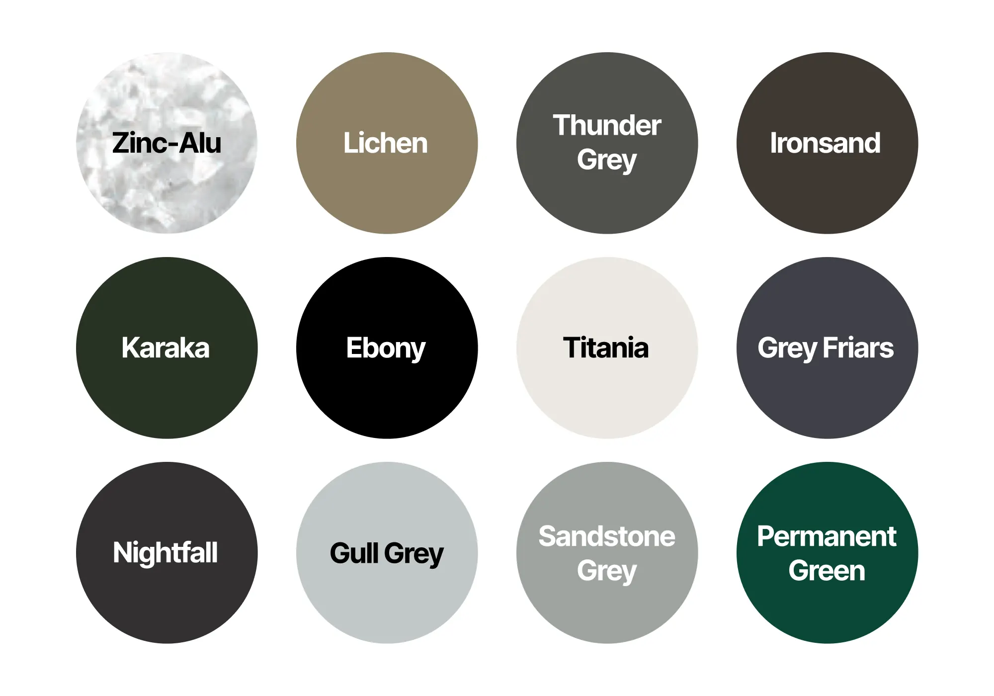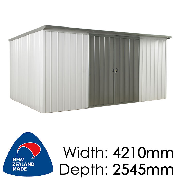 - Colour Choices – Select standard Zincalume, a single colour, or a two-tone combination with separate wall and trim/roof colours. Wall options include Gull Grey, Lichen, Titania, and Sandstone Grey; trim, door and roof colours include Ebony, Karaka, Ironsand, Grey Friars, Permanent Green, Thunder Grey, and Nightfall.