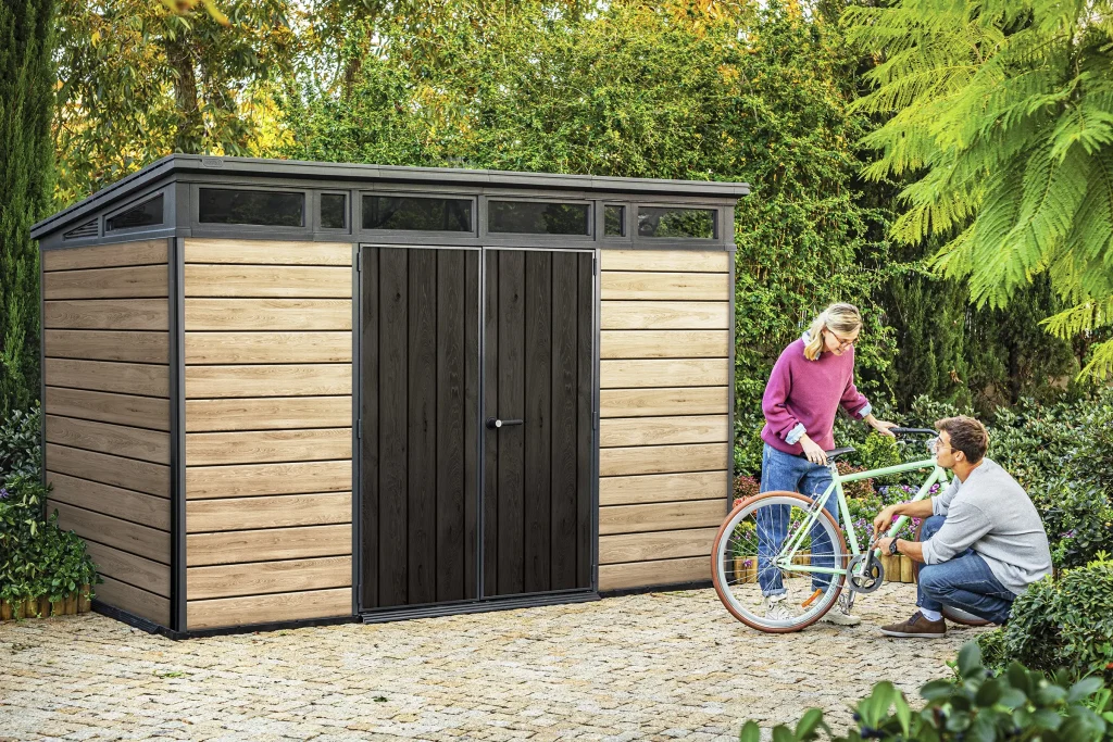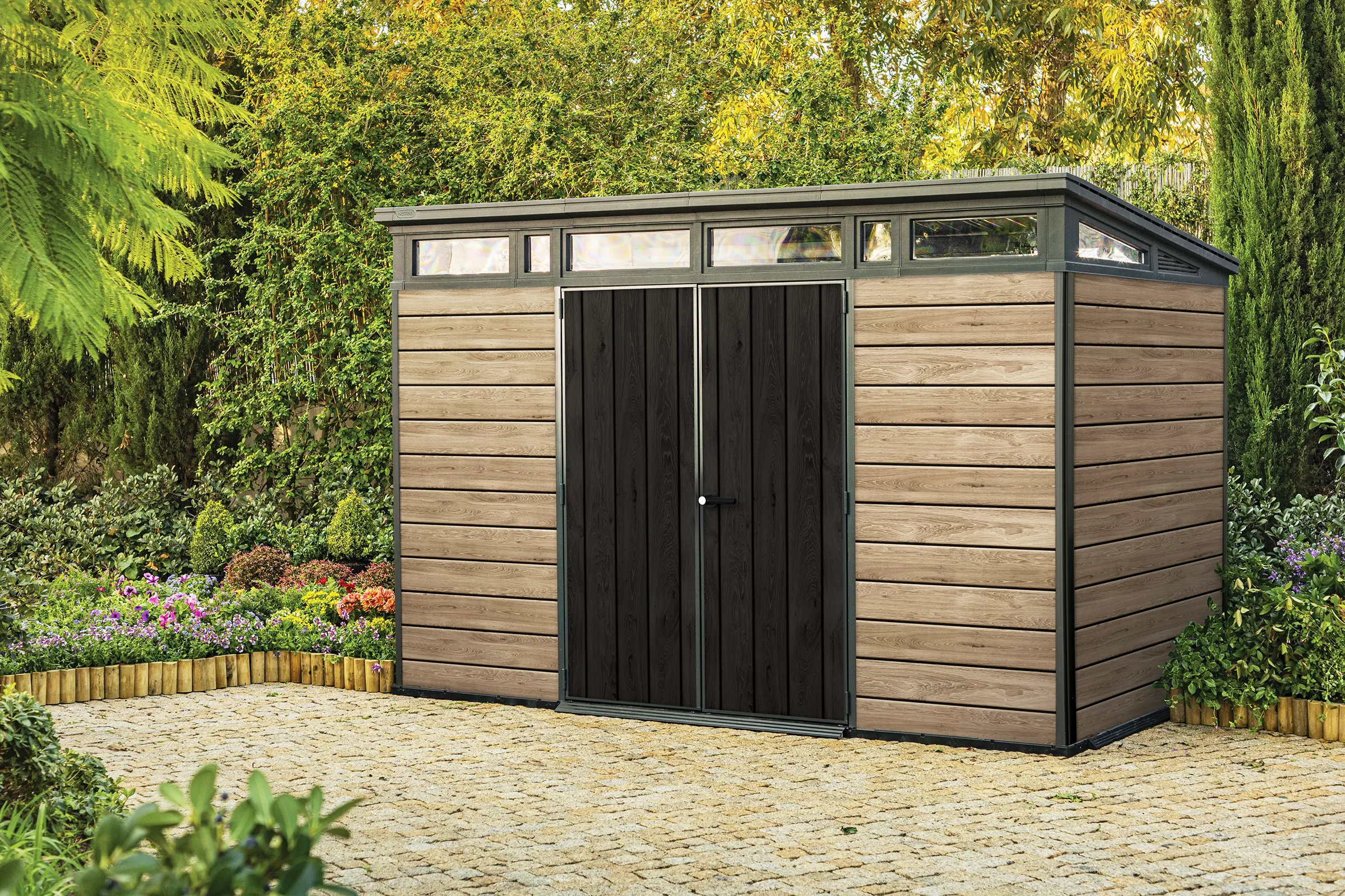 The Keter Ashwood 11×7 Outdoor Storage Shed offers generous internal space and a high ceiling, ideal for storing garden tools, outdoor furniture, sports gear, and bulky equipment while still allowing easy movement inside. Its Ashwood-look DECOCOATâ„¢ panels deliver timber-style appeal without the upkeep, and wide, lockable double doors provide straightforward, secure access.