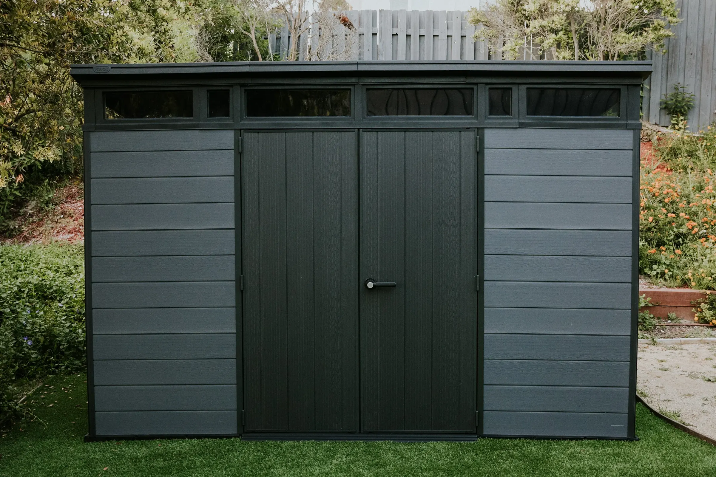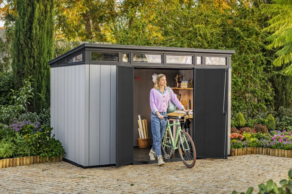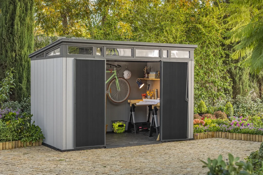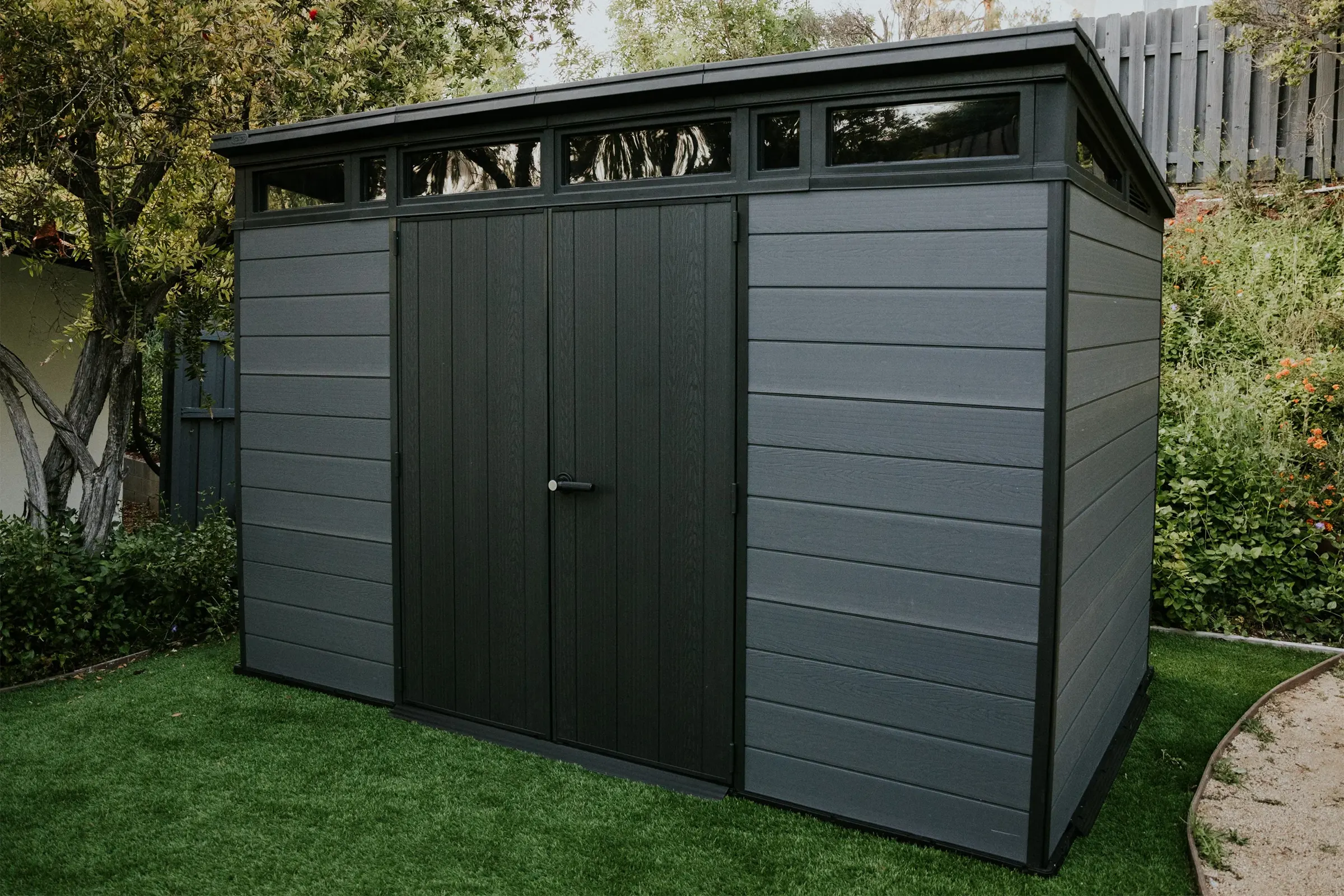 The Keter Cortina 11×7 Outdoor Storage Shed provides ultra-spacious, reliable storage for garden tools, large equipment, and outdoor gear. Its strong, steel-reinforced, double-wall construction and integrated floor deliver dependable, long-lasting performance, while the clean, modern design complements contemporary gardens.