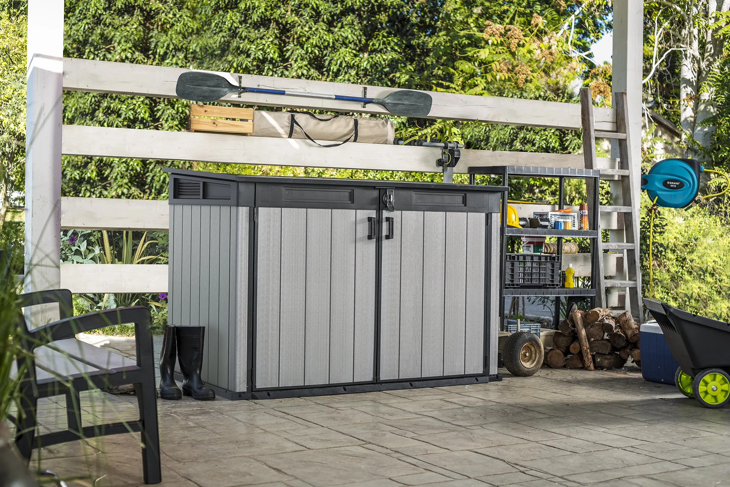 - Paintable DUOTECH™ walls: Finish the rustic wood-look panels in colours that match your house, fence, or landscaping for a cohesive outdoor setting.
