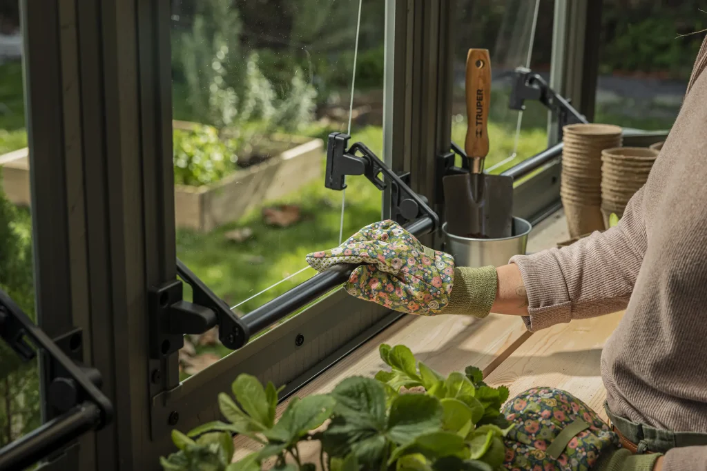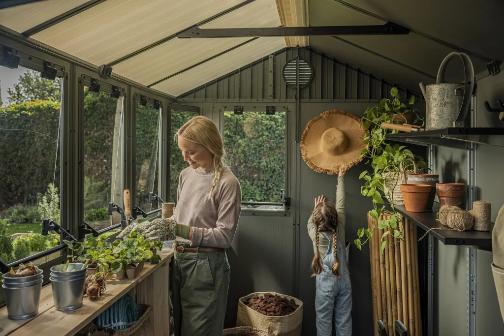 • Use the generous natural light from the acrylic windows and translucent roof panel to create an ideal space for seed trays, cuttings, and indoor-style planting.