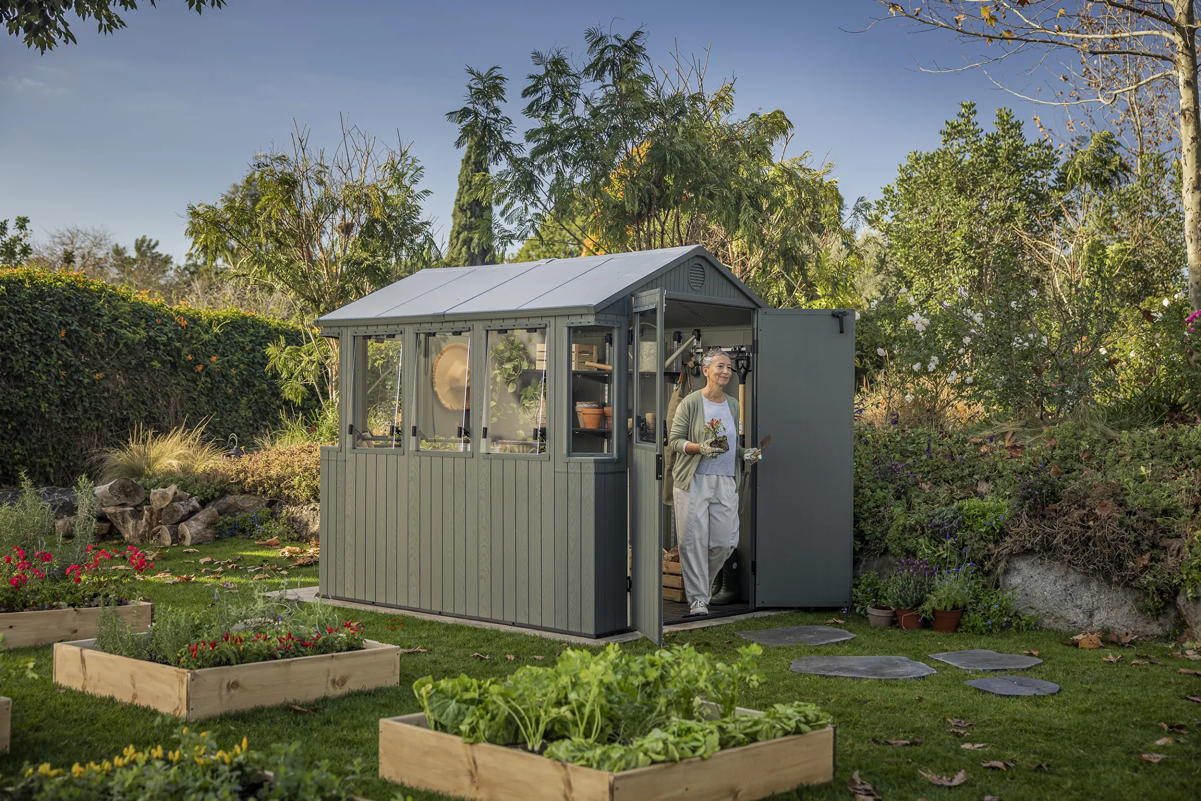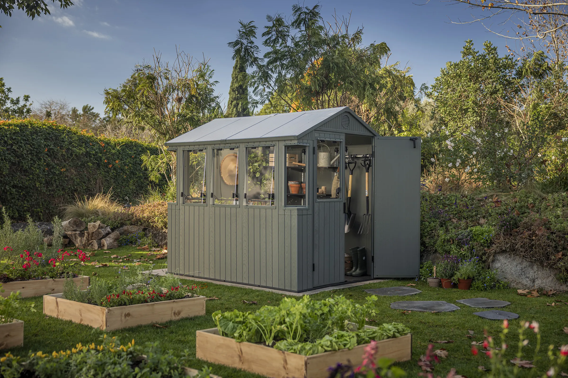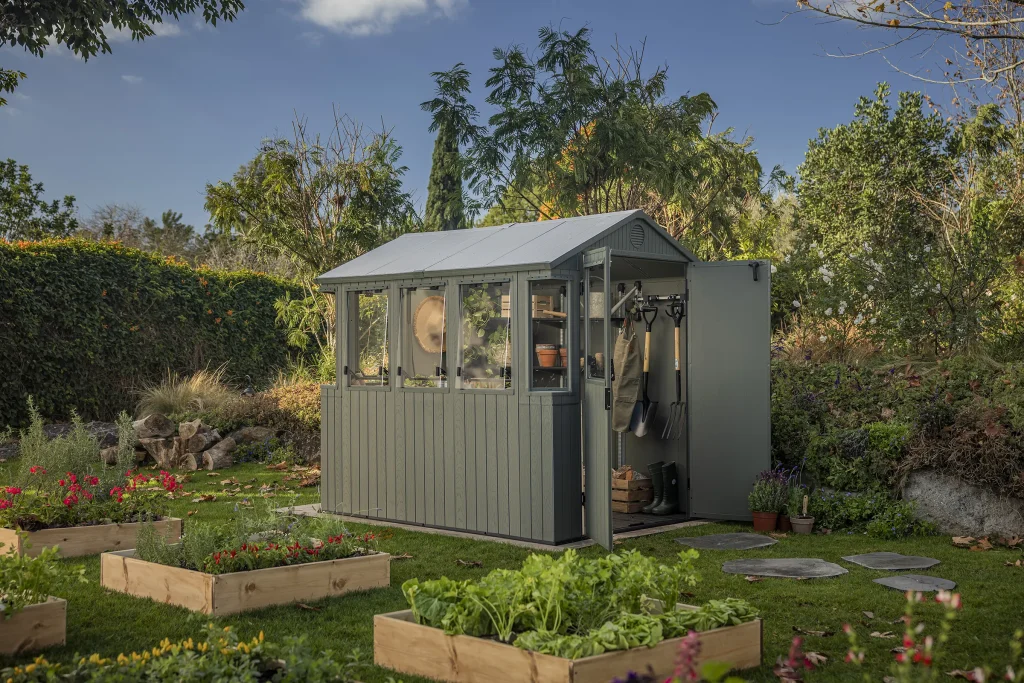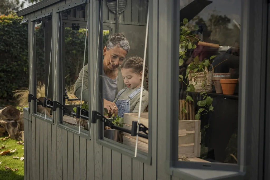 The Keter Potting Shed 6×8 is designed as a bright, functional workspace that can adapt to different gardening and lifestyle needs. Multiple windows, a hybrid roof, and wide double doors make it suitable for a range of uses, from potting and propagation through to general storage or a small backyard retreat.