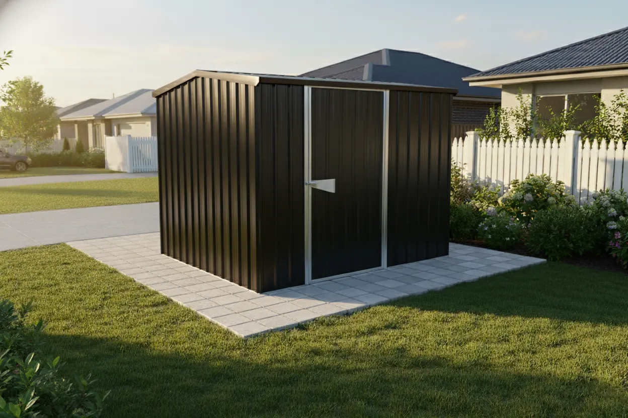 This shed is supplied as a ready-to-go kitset with a defined layout and structure. The provided information does not specify configurable options for repositioning doors or windows, altering dimensions, or changing cladding types or colours beyond the Ebony with Zinc trim finish.
