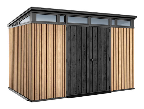The Venetian 11×7 combines luxury design with premium functionality. Featuring rich brown wood tones, sleek lines, and 13.7 m³ of storage, it easily accommodates a riding mower, bikes, and garden tools. Its weatherproof DECOCOAT™ walls won’t chip, peel, or rot, while crystal-clear windows and double lockable doors provide light and security. A steel-reinforced roof (150 kg/sqm) and heavy-duty floor ensure lasting strength, and assembly is simple with standard tools.