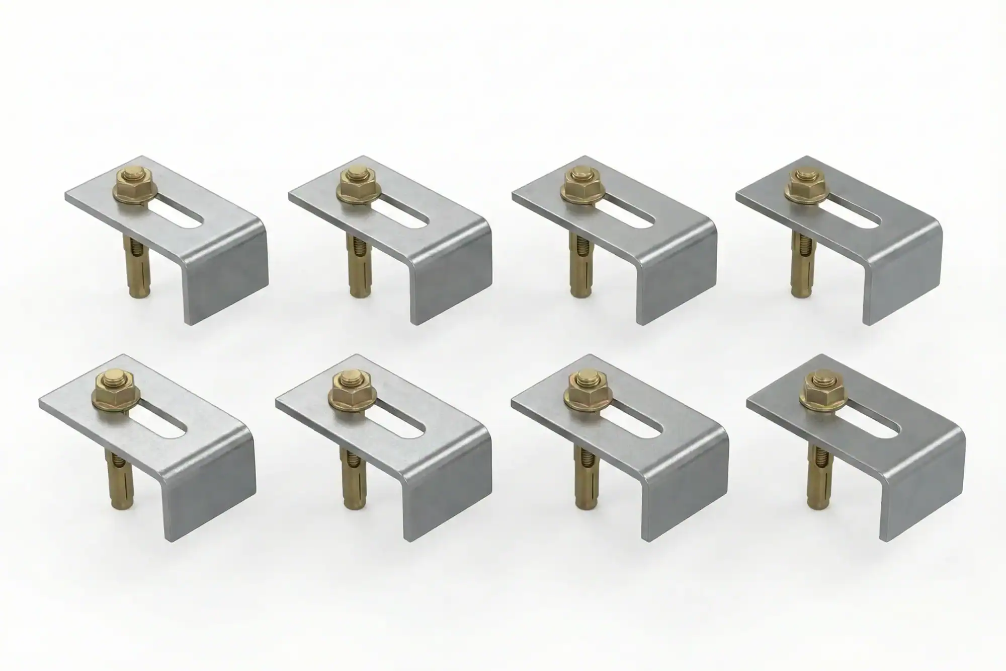 The kit has a unique bracket design to clamp down tightly onto the channels and includes 8 floor clamps and 8 fixing screws.